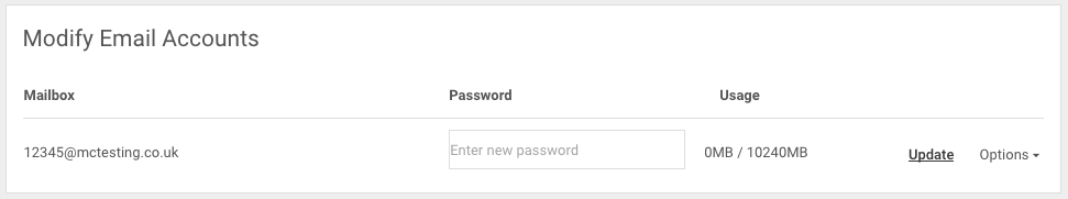From this page scroll down to Modify Email Accounts and you can update the password by typing this into the Password field and clicking Update:
