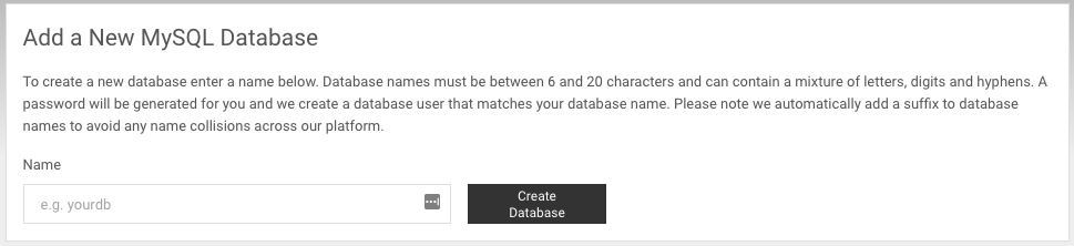 From the subsequent page you can choose the name of the database as long as this matches the naming rules outlined there, the password will be automatically created for you and you can update this once the database has been created: