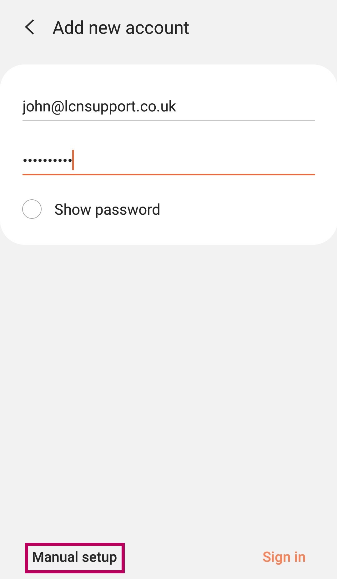 - Enter your Email Address and Password in the fields and then tap MANUAL SETUP.